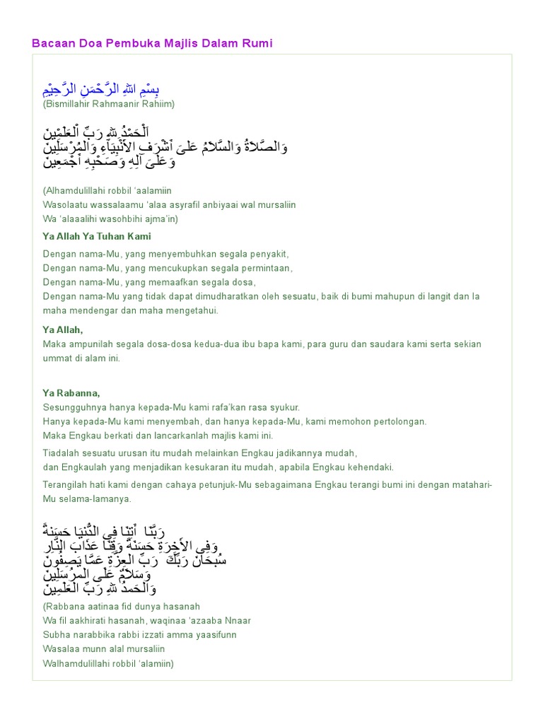 Bacaan Doa Pembuka Majlis Dalam Rumi. Dengan nama-Mu yang tidak dapat dimudharatkan oleh sesuatu baik di bumi mahupun di langit dan Ia maha mendengar dan maha mengetahui. B menetapkan uluhiyah hanya kepada allah semata tidak ada sekutu bagi allah.
